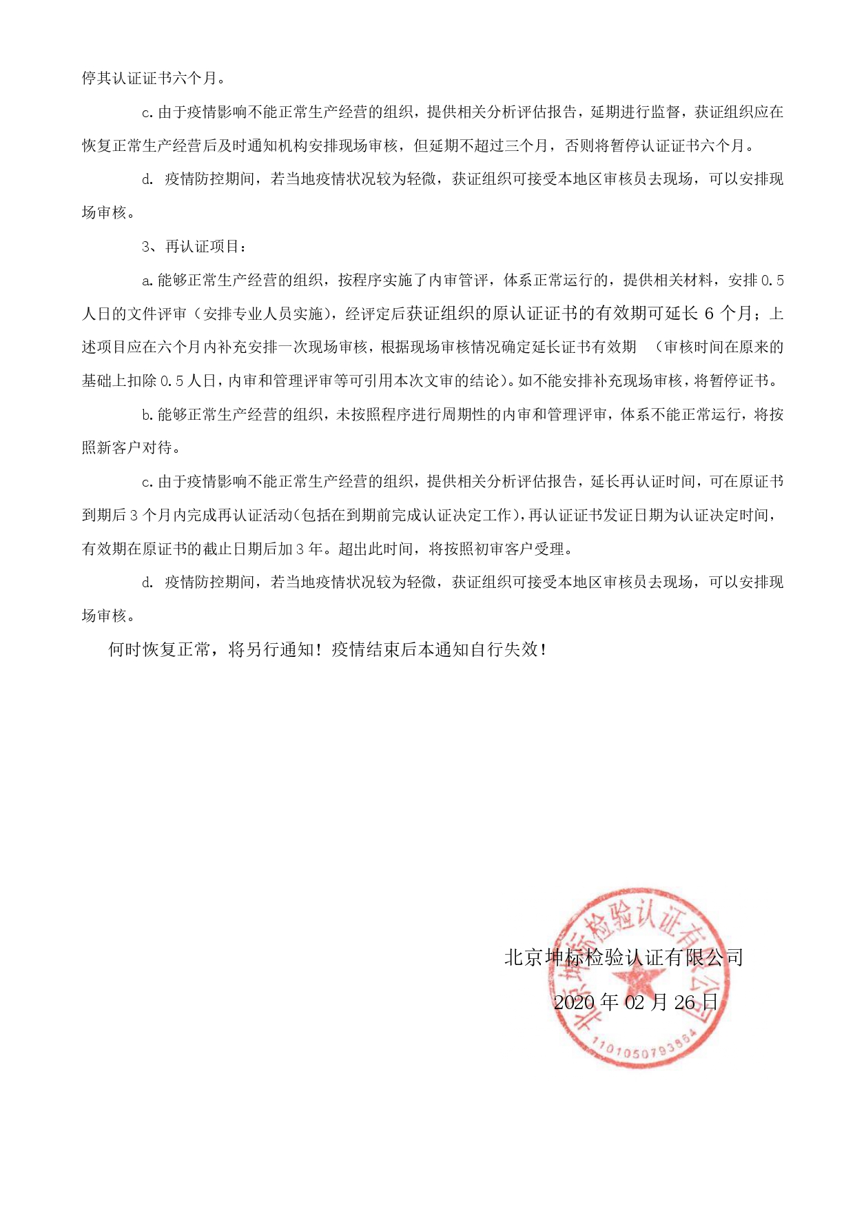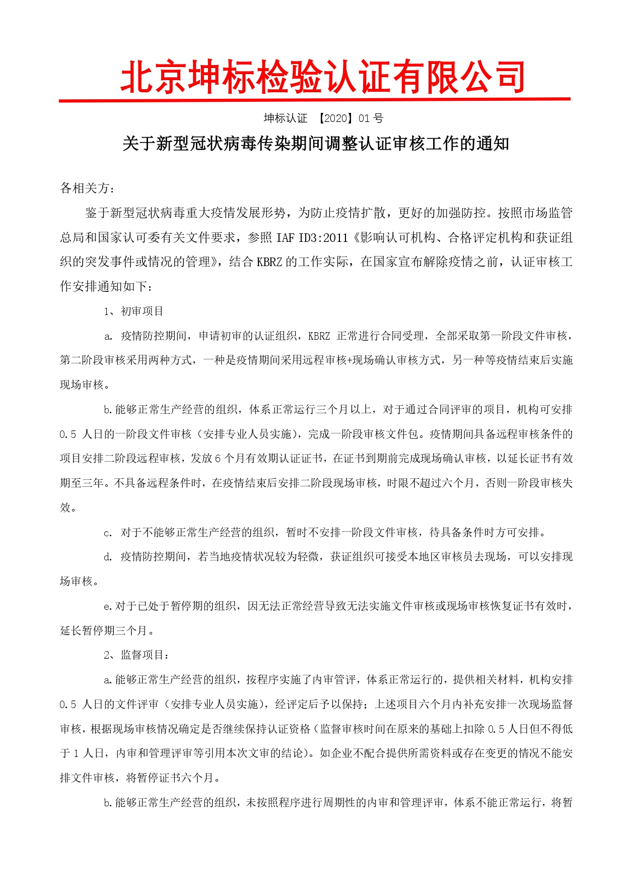 關于新型冠狀病毒傳染期間調整認證審核工作的通知